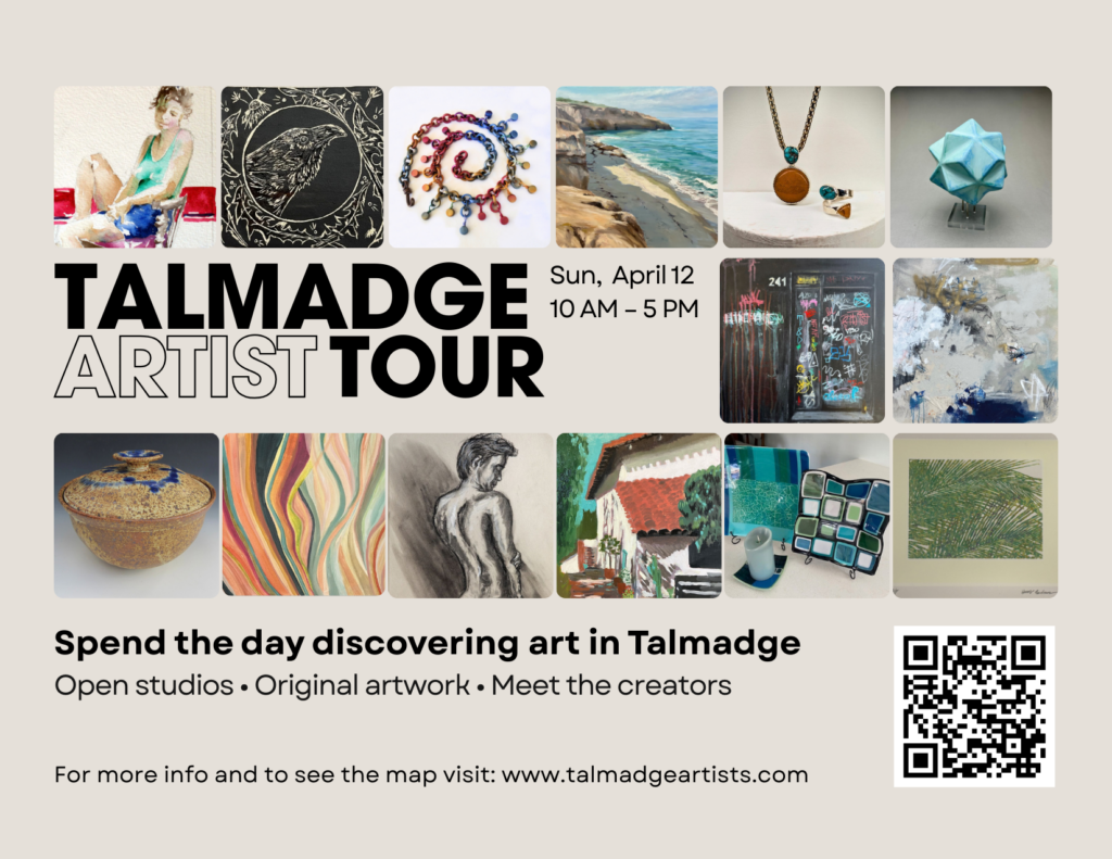 Explore the captivating works of local artists on a free, self-guided tour of the quaint Talmadge neighborhood in Central San Diego. A group of talented artists are opening their home-based studios to the public in this one-day event.